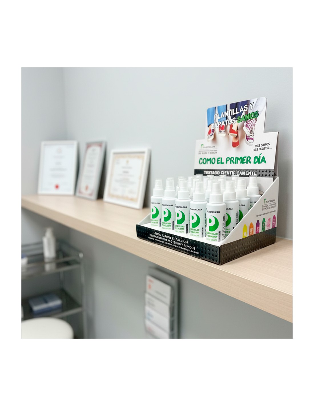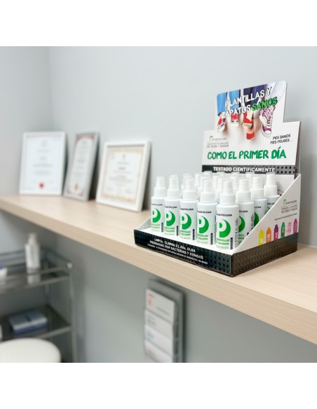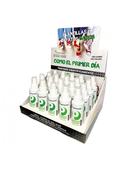 El Expositor Planticlean reúne 20 sprays de Planticlean Plantillas & Calzado (100 ml), un producto diseñado para mantener las plantillas y el interior del calzado limpios, higienizados y libres de malos olores. Su acción antimicrobiana reduce hasta un 99,9 % las bacterias y elimina hongos en la mayoría de situaciones hasta en un 100 %, convirtiéndolo en un complemento esencial en la prevención y cuidado del pie.