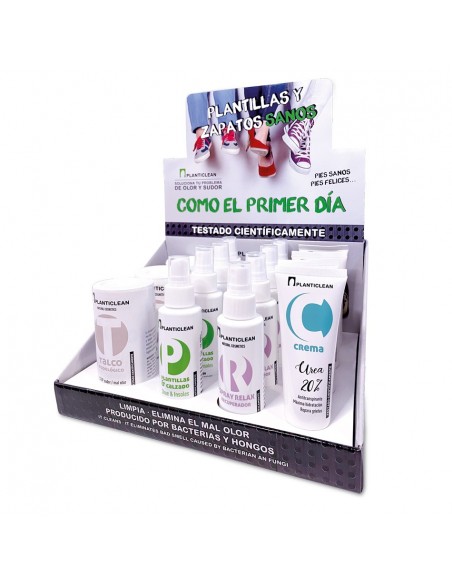 El Expositor Combinado Planticlean reúne una selección de los productos más eficaces de la gama, diseñados para ofrecer soluciones completas en el cuidado e higiene del pie. Su formato compacto y la presentación en expositor de regalo permiten tener en un solo lugar los productos esenciales para la prevención y tratamiento de sudoración, mal olor, hongos, durezas y fatiga plantar.