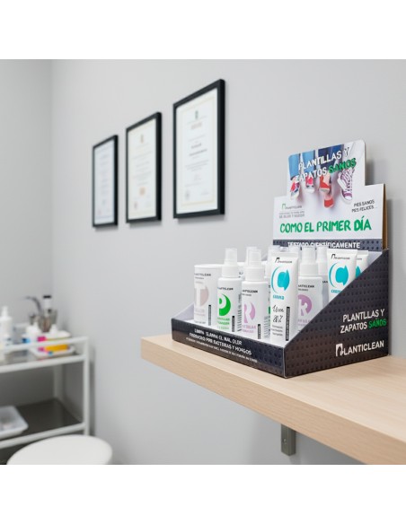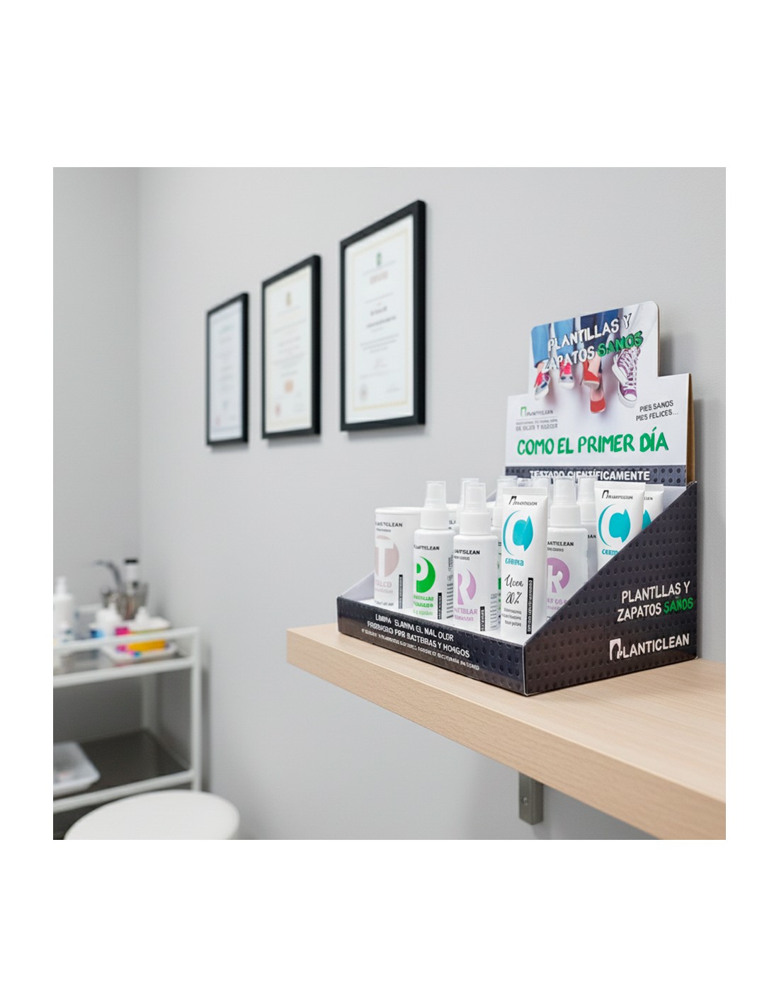 Un expositor completo que reúne los productos clave de Planticlean, garantizando un cuidado avanzado y profesional de pies y calzado.