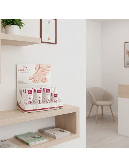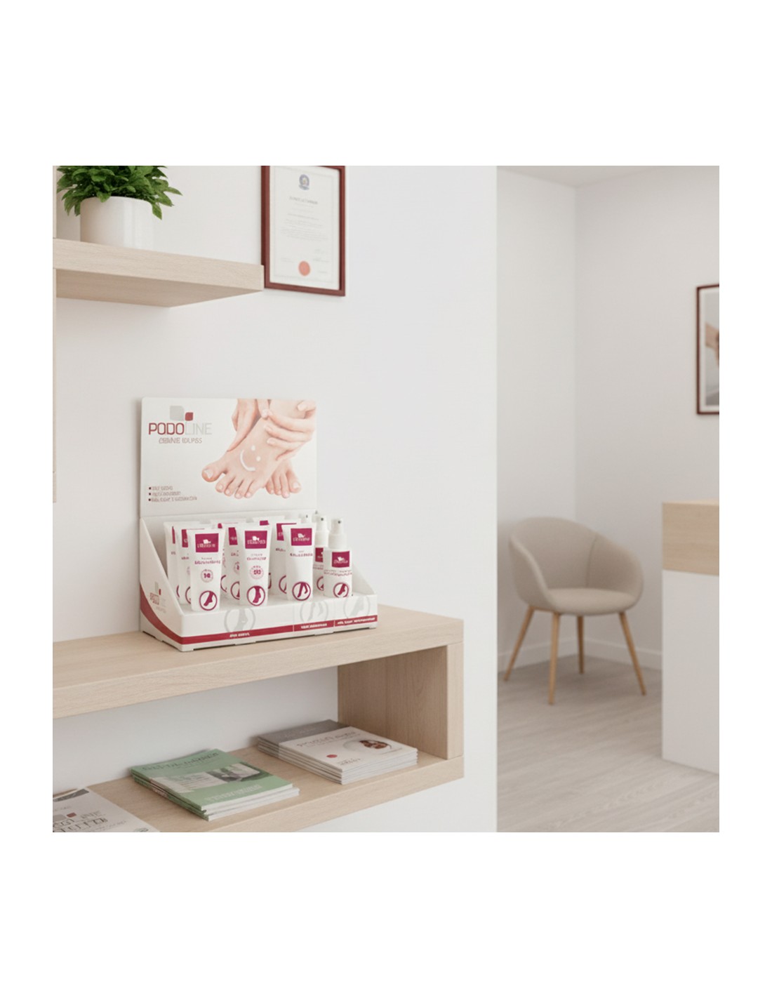 El Expositor Podoline es la solución práctica y atractiva para que tu clínica ofrezca a los pacientes una selección de los productos más demandados en cuidado podológico diario. Su diseño compacto permite colocarlo en recepción o en la sala de espera, potenciando la recomendación profesional y la venta directa.