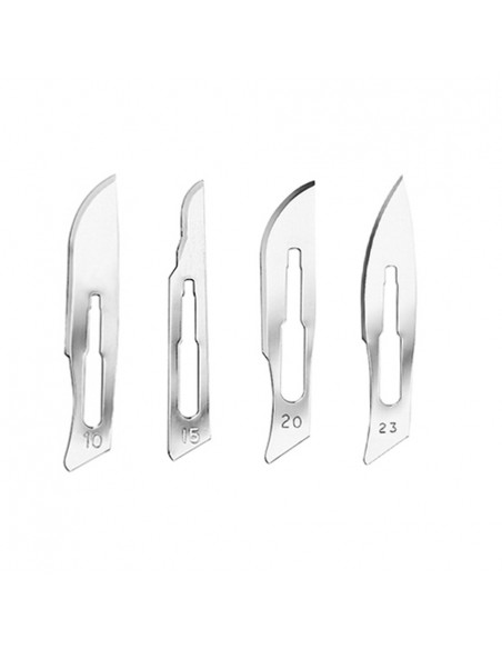 Cada hoja viene esterilizada mediante óxido de etileno y envasada individualmente en blíster de seguridad, lo que garantiza la asepsia hasta el momento de su uso. Gracias a su presentación en caja de 100 unidades, resultan prácticas y económicas para un uso profesional continuado.