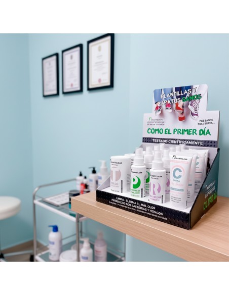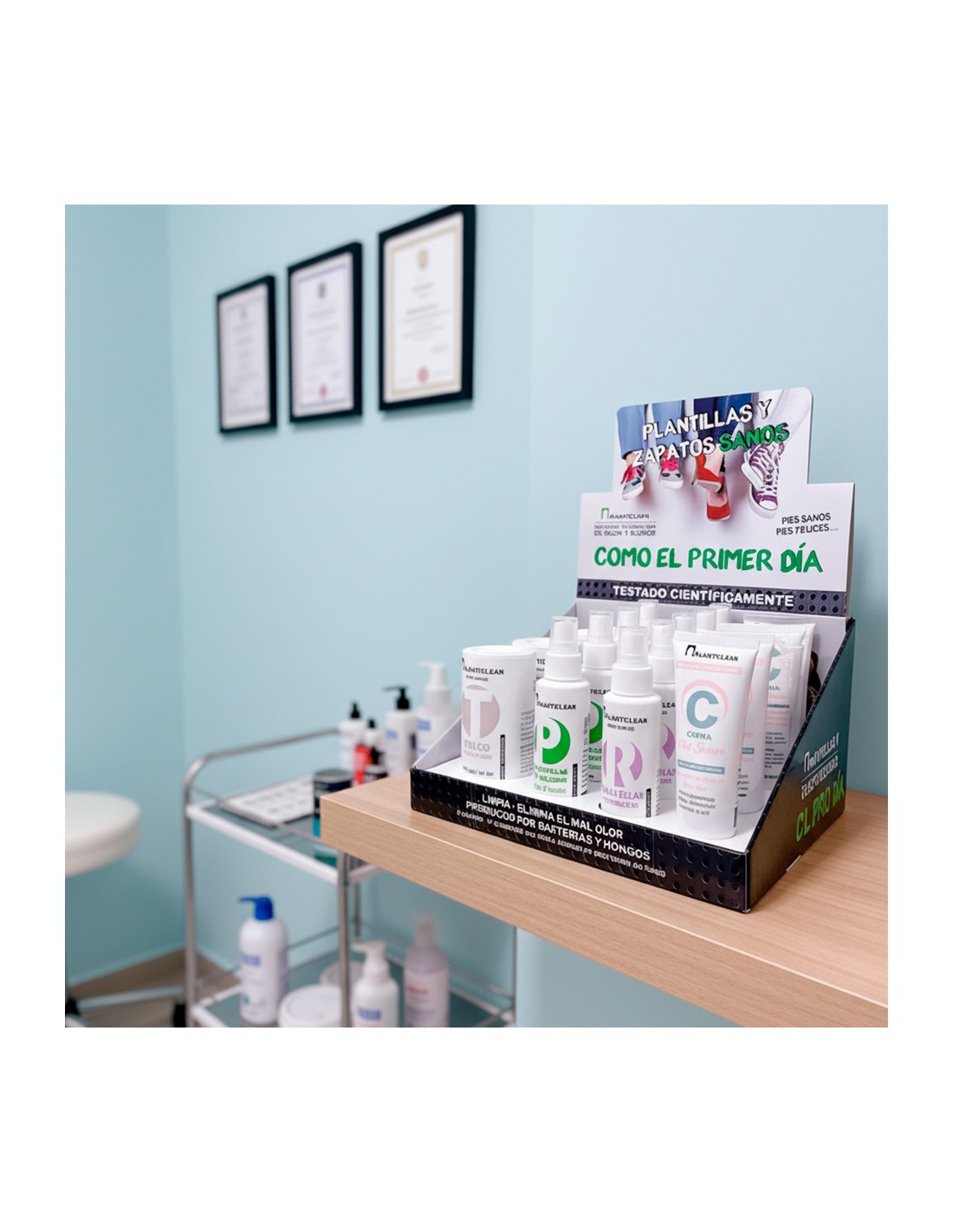 El Expositor Combinado Planticlean con Crema Piel Suave ofrece un conjunto equilibrado de soluciones que garantizan un cuidado profesional y avanzado de pies, piernas y calzado.