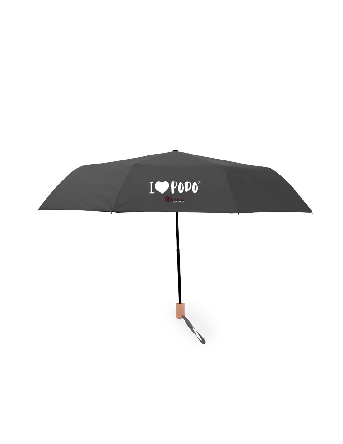 Paraguas plegable gris “I Love Podo” de pongee 190T RPET, resistente y sostenible. Diseño antiviento con varillas metálicas, mango de madera y funda de transporte. Diámetro de 95 cm y etiqueta RPET certificada.